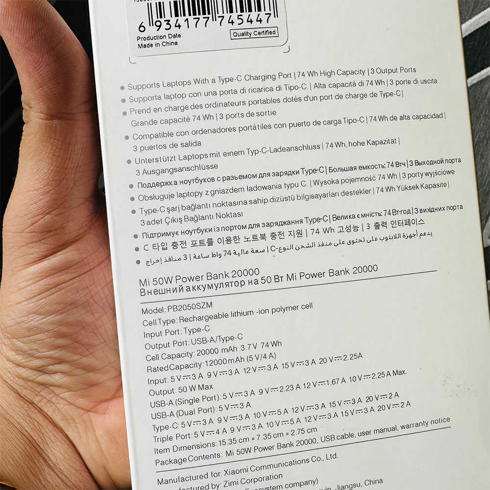 Xiaomi Mi Power Bank PB2050SZM Specifications: